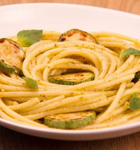 BUCATINI COM PESTO GENOVESE E ABOBRINHA: LEVEZA E FRESCOR NA MEDIDA CERTA