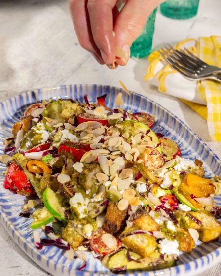 SALADA DE FOCACCIA COM PESTO LIMONE BARILLA, LEGUMES E AMÊNDOAS: UMA ÓTIMA ESCOLHA PARA AS CONFRATERNIZAÇÕES DE FIM DE ANO