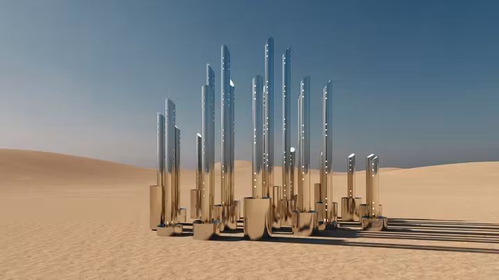 Para o deserto egípcio, Ana leva “Vento”, instalação que captura algo que normalmente escapa aos nossos olhos: a energia invisível do ar em movimento. São 21 flautas gigantes de alumínio polido, com alturas entre 2,5 e 5 metros, dispostas em formação espiral. Quando as brisas atravessam essas estruturas, cada uma afinada em nota diferente, criam uma melodia única comandada apenas pela natureza.
