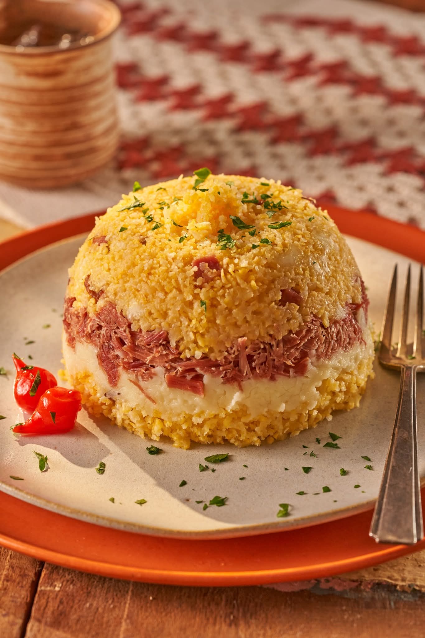 Coloque camada de carne seca e por cima dela, uma camada de queijo tipo catupiry. Por último, coloque mais uma camada da massa do cuscuz e leve para cozinhar por cerca de 5 a 10 minutos na cuscuzeira.