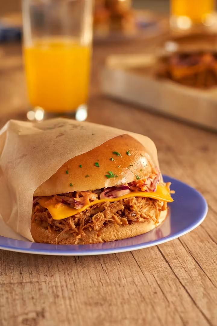 Distribua o recheio de frango sobre os pães e coloque uma fatia de queijo cheddar em cada lanche. Cubra com a salada de repolho e cenoura.