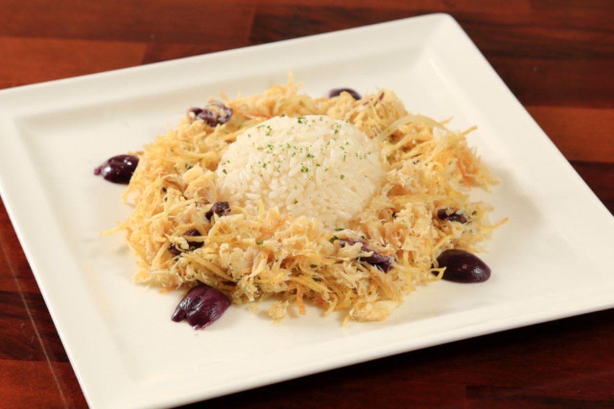 – Bacalhau a Bras, feito com bacalhau desfiado refogado no azeite, alho, cebola, ovo e batata palha Acompanha arroz branco (R$ 115);