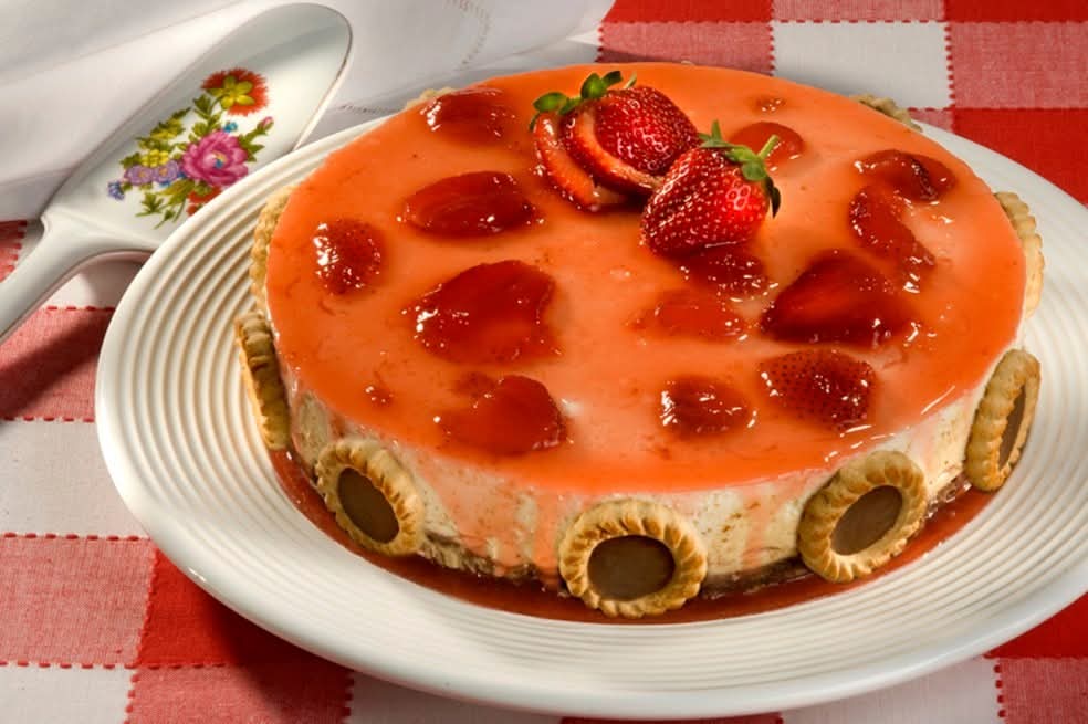 A receita é feita com base crocante de biscoito maizena e chocolate, mousse leve de ricota com baunilha e uma calda de morango que traz frescor, além de ser finalizada com biscoitos recheados na decoração. Sirva gelada e encante seus convidados com sabor e textura irresistíveis.