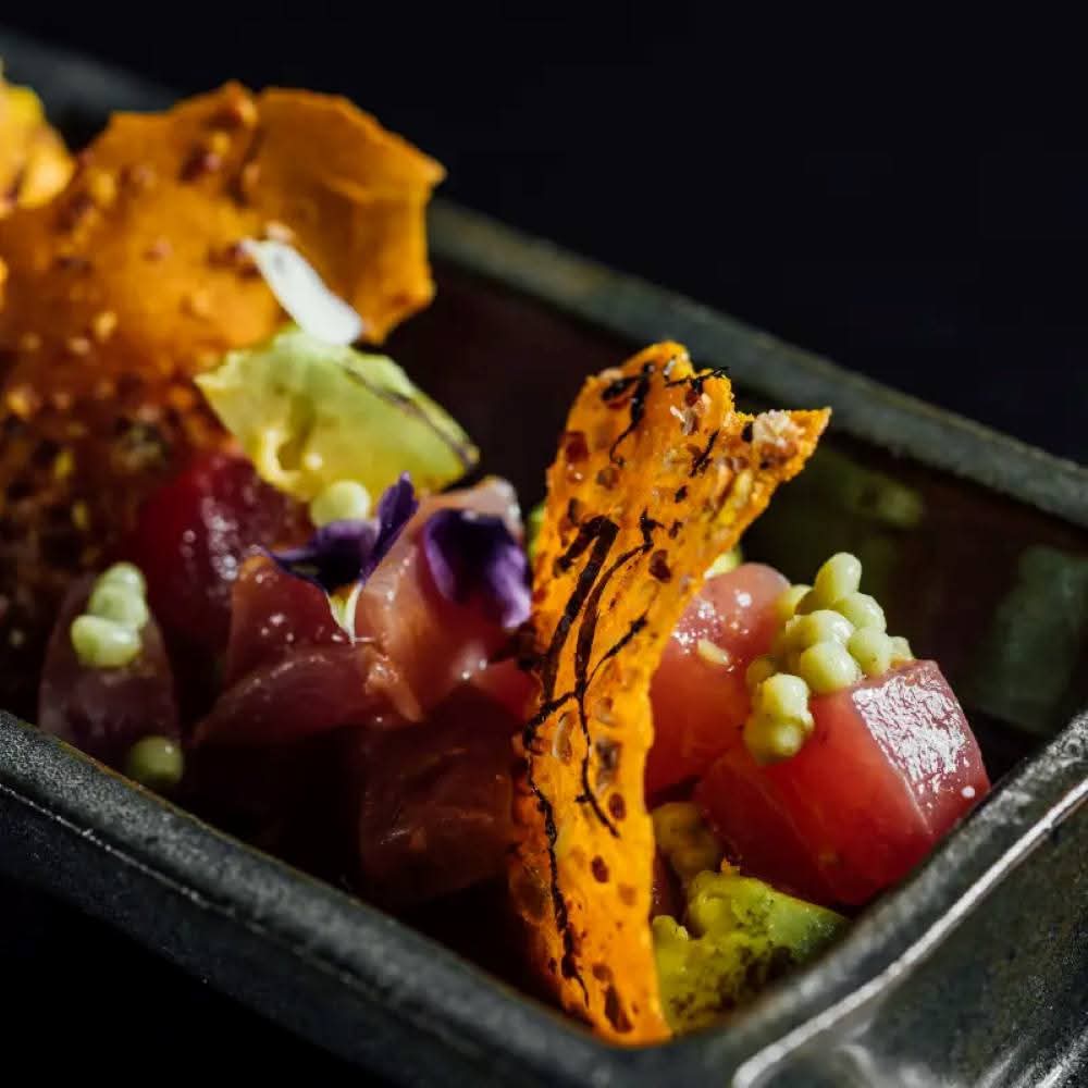 Atum – atum, abacate, caviar wasabi, nori ao molho ponzu e crocante andino;