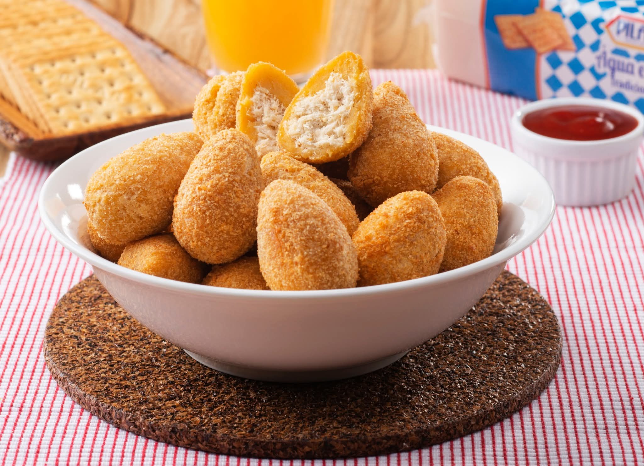 Faça um petisco clássico com massa macia feita de caldo de frango e farinha de trigo, recheada com frango refogado e temperado.