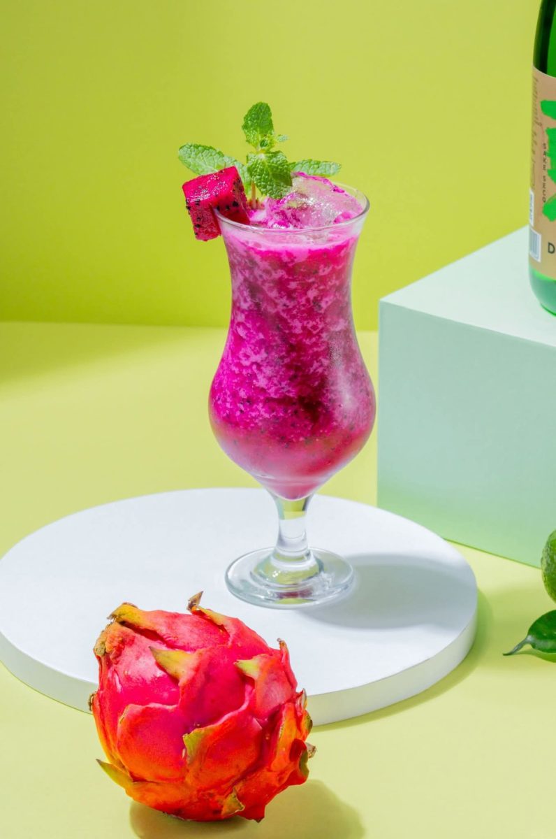 Amassar a pitaya, adicionar limão, calda de agave, açúcar, Sake e gelo.