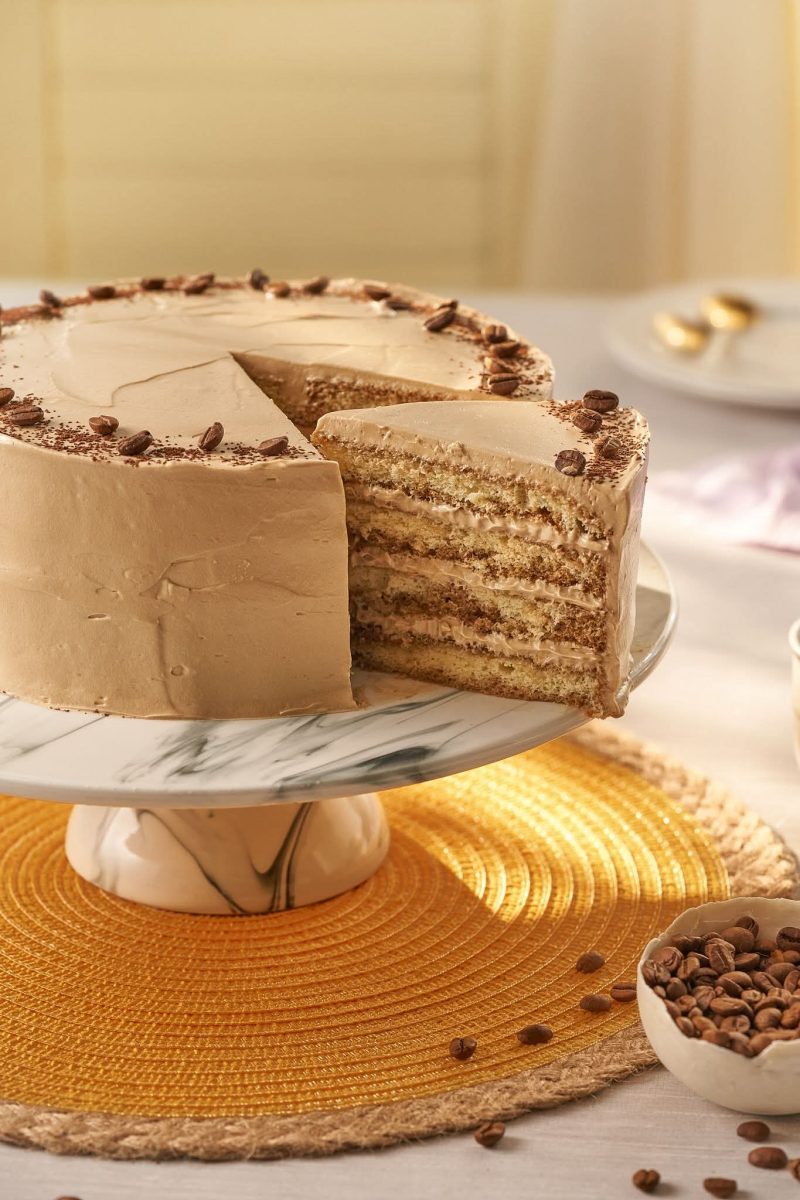 Coloque a primeira camada de massa no prato de bolo e regue com a calda de café, de modo a deixá-la bem úmida. Coloque um terço do creme de café separado para o recheio e repita o processo com as demais camadas de massa, calda e recheio.