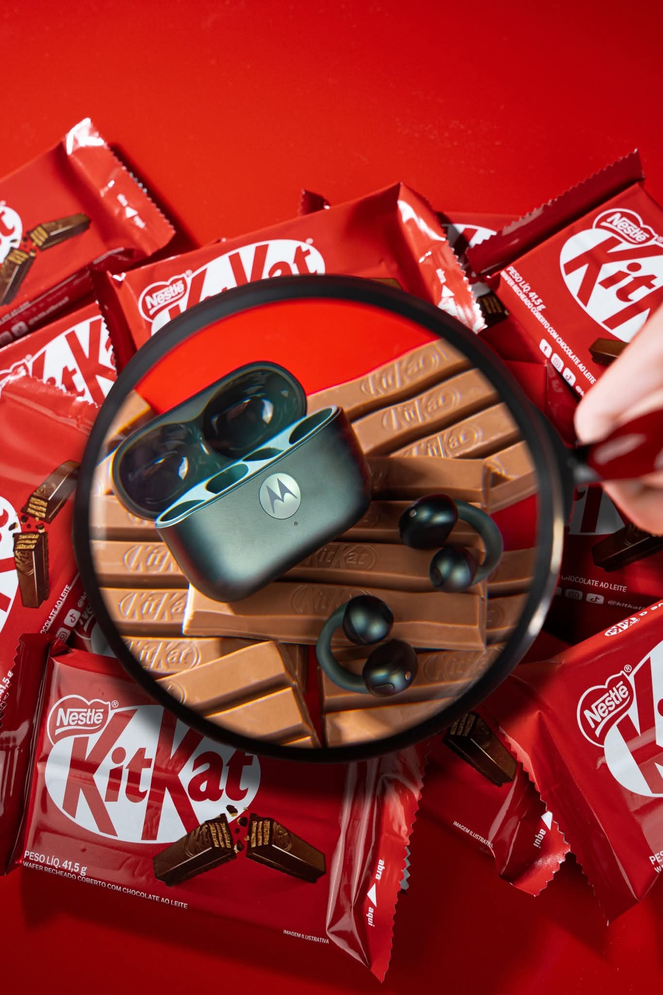 No kit, os influenciadores recebem os fones de ouvido moto buds loop e uma versão exclusiva e personalizada do smartwatch moto watch fit, criada especialmente para a collab. Um detalhe inusitado torna a experiência ainda mais especial: os gadgets chegam com um delicioso aroma de chocolate, desenvolvido exclusivamente para esta parceria e inspirado no universo KitKat®. Assim como a Motorola já faz em suas linhas, ao incorporar uma fragrância própria e exclusiva aos produtos graças à parceria com a Firmenich, nesta collab a marca criou um aroma personalizado para acompanhar os devices e potencializar a conexão sensorial com a campanha. Os itens serão entregues em uma bolsa especial, reforçando a proposta de oferecer uma experiência única — que combina o prazer de um break com a qualidade sonora Motorola com tecnologia Sound by Bose e toda a funcionalidade do smartwatch.