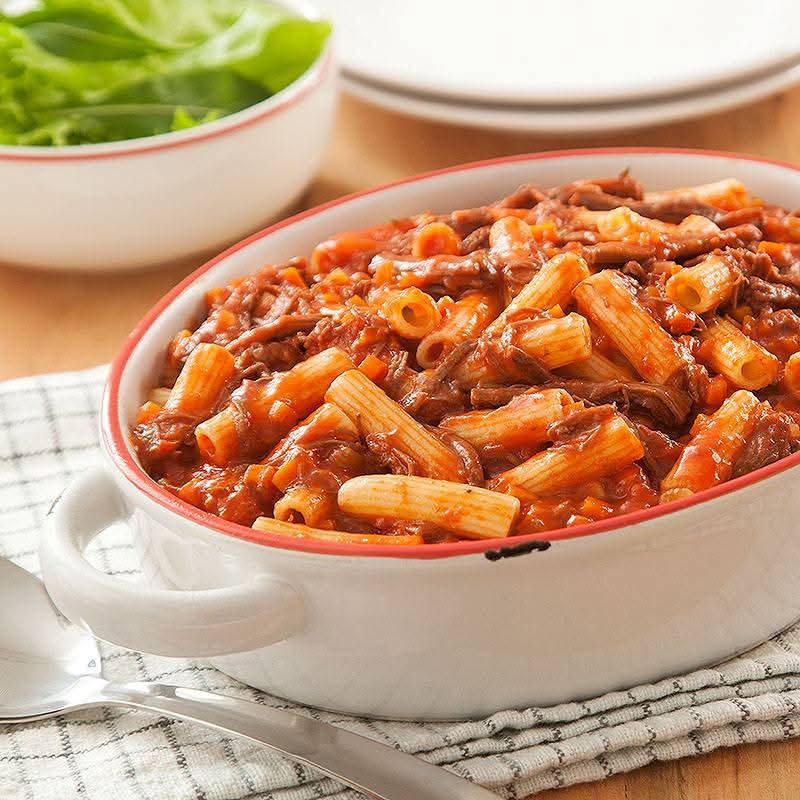 O prato principal fica por conta do Macarrão ao Ragu de Costela, uma receita que combina a carne desfiada com o toque da massa, resultando em um prato saboroso, perfeito para aquele almoço de domingo em família.