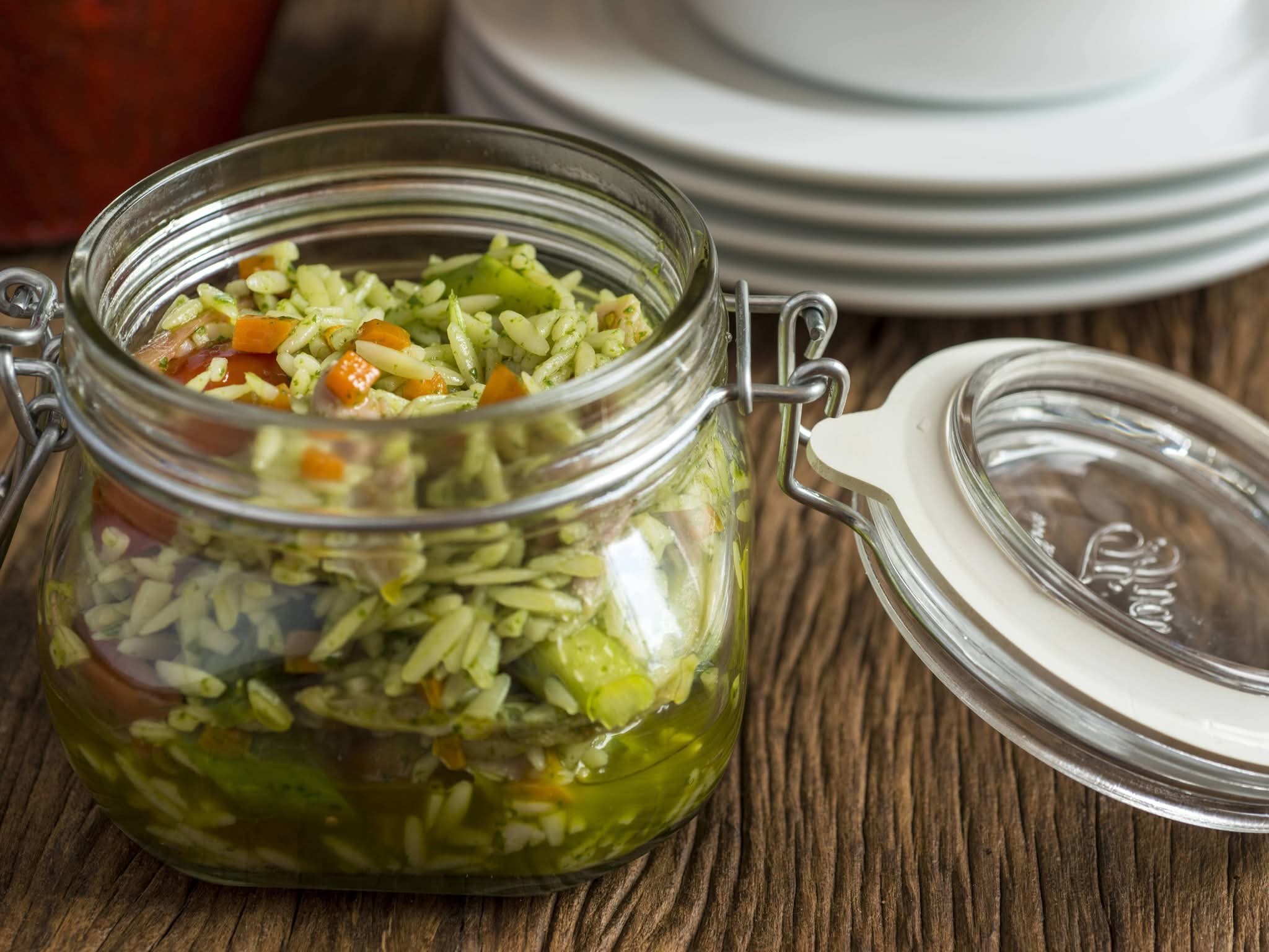 Escorra o excesso de água e misture o risoni com os legumes e frango, os tomates cereja e o pesto de rúcula.