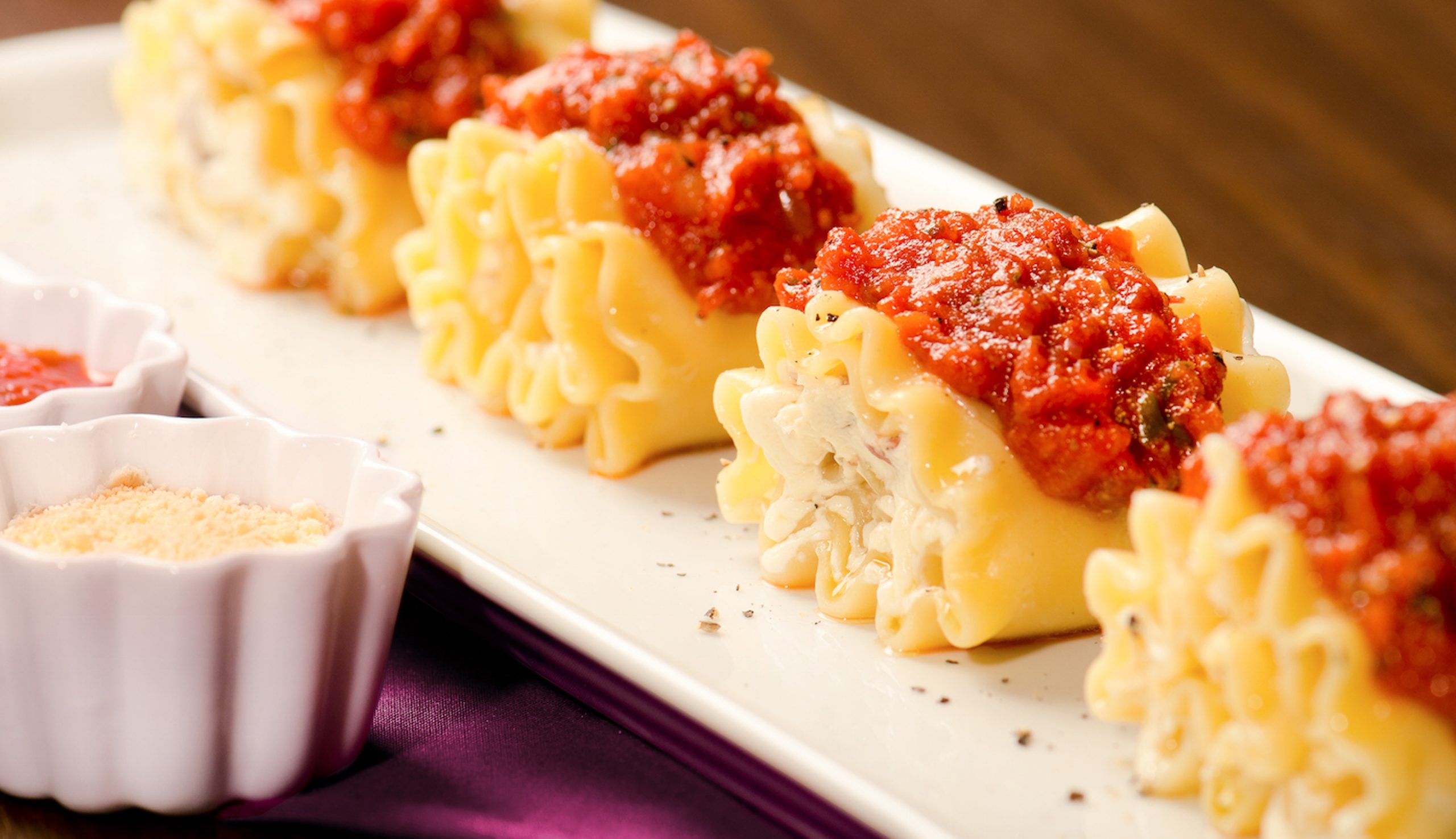 Forre o fundo de uma travessa refratária com o molho de tomate e coloque os “rocamboles” de lasanha, um ao lado do outro.