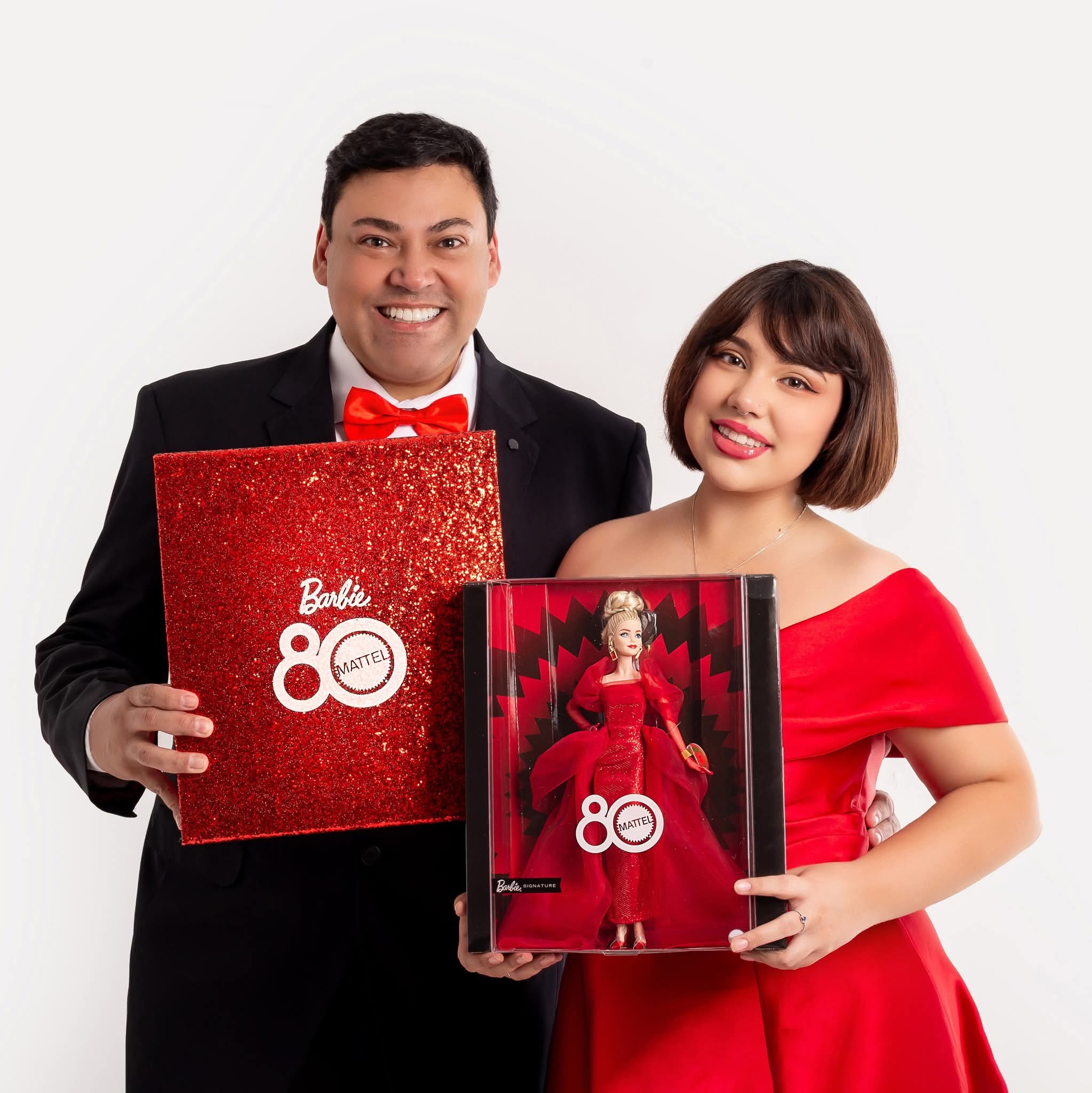 A boneca enviada a família Guedes é uma verdadeira joia de colecionador. Ela celebra as oito décadas da Mattel, uma empresa que continua a empoderar gerações através da brincadeira. Pronta para brilhar no tapete vermelho, a Barbie usa um vestido deslumbrante com tecido brilhante, complementado por mangas em formato de laço e uma cauda dramática em tule.