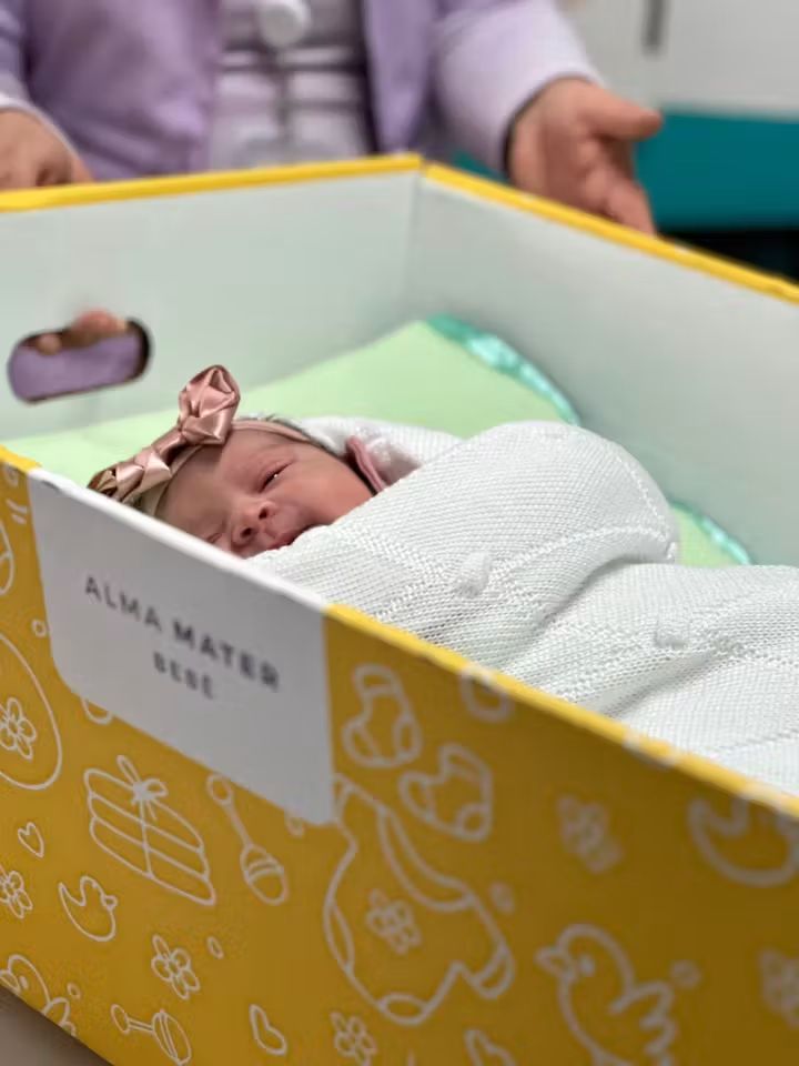 Após o nascimento do bebê, a mãe é atendida pela equipe da Alma Mater, que realiza uma escuta ativa e oferece orientações essenciais sobre aleitamento materno, cuidados com o recém-nascido, importância da rede de apoio e saúde mental de mãe e filho. Essas orientações são complementadas por vídeos desenvolvidos por profissionais de saúde, acessíveis por meio de QR Codes impressos em uma pasta especial que também serve para organizar os documentos da criança com segurança. No mesmo atendimento, a mãe recebe a caixa-berço, kits de higiene para ela e para o bebê, além de uma cesta básica, proporcionando suporte integral no início dessa nova fase.