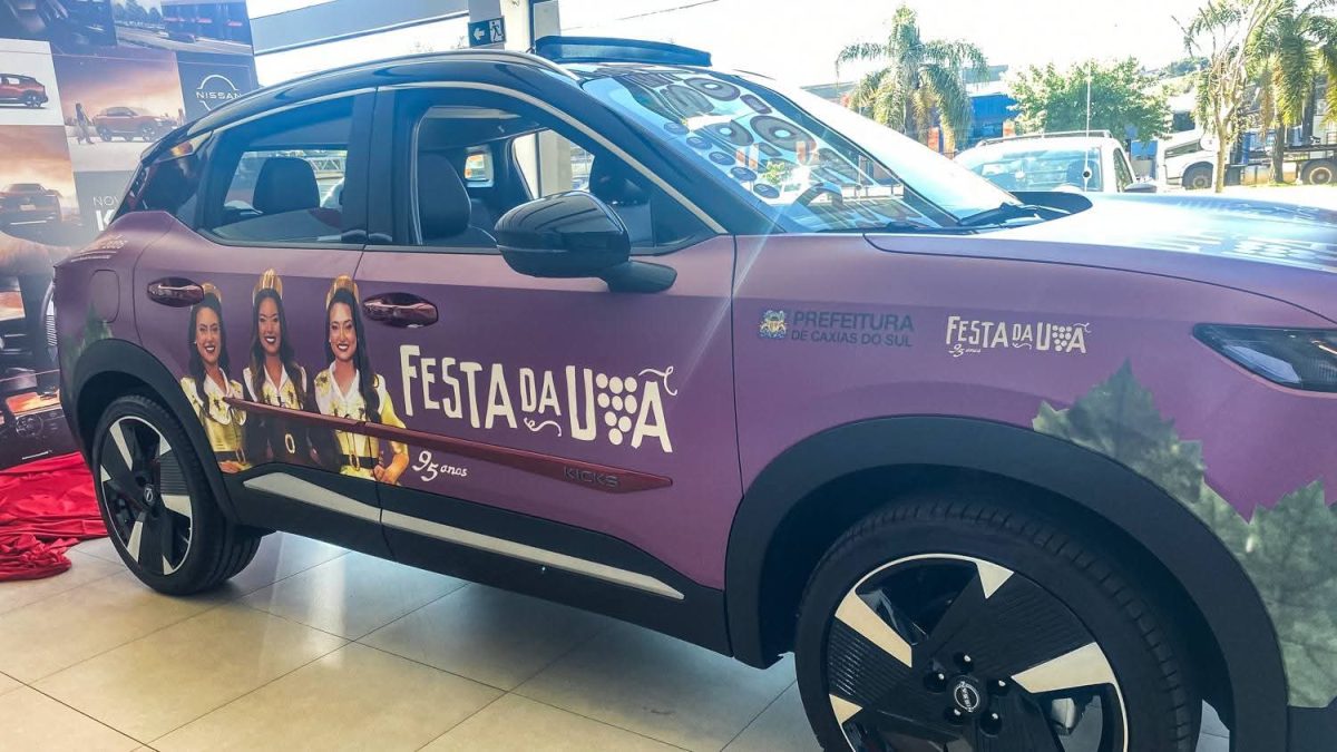 Além de conduzir o Trio ao longo da programação, o veículo também cumpre um papel de divulgação do evento. O Novo Nissan Kicks circula pela cidade envelopado com a arte oficial do cartaz da Festa da Uva 2026 e com a foto da Rainha e das Princesas, com assinatura da Intervene Comunicação, ampliando a presença visual da Festa no dia a dia de Caxias do Sul.