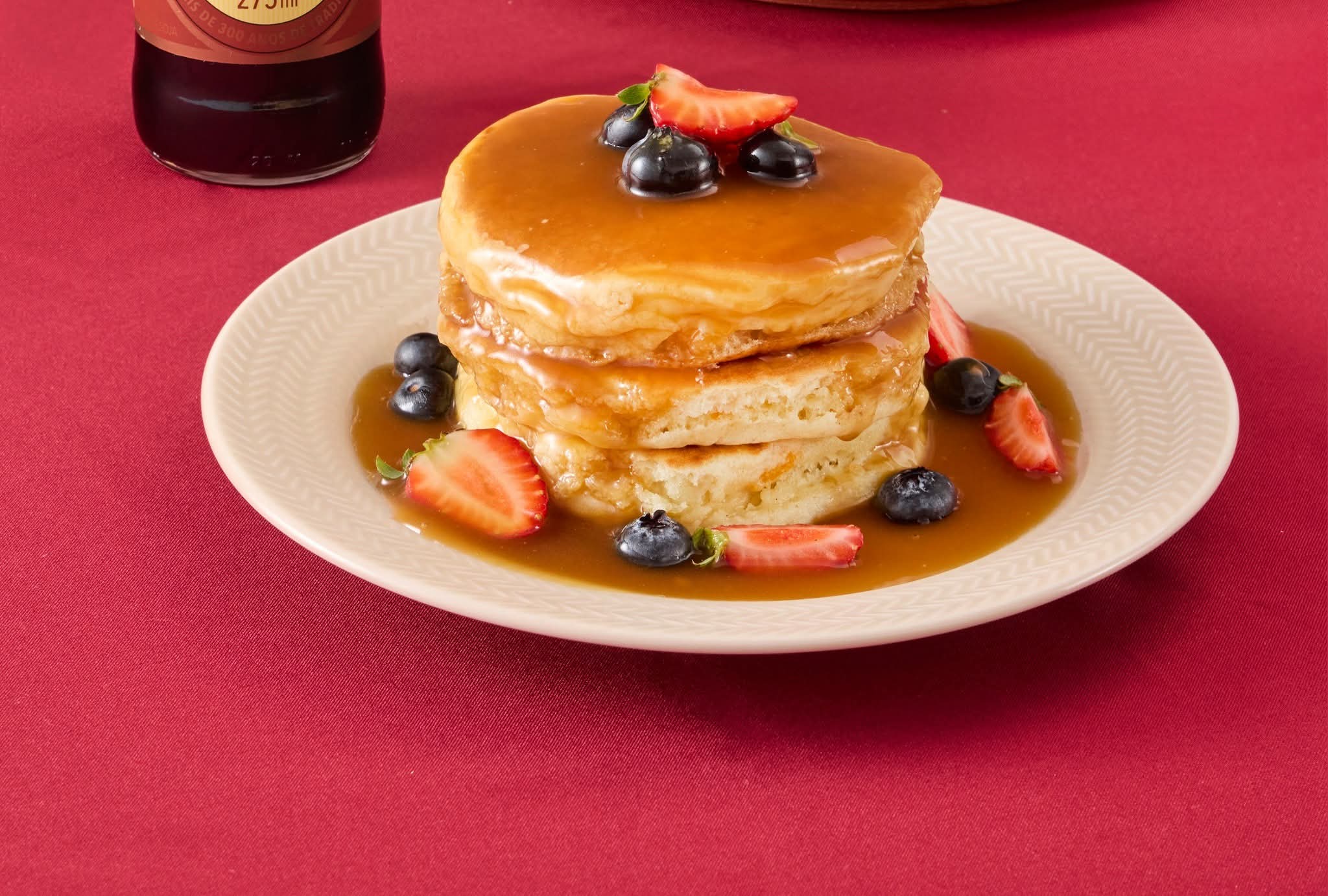 Além da calda, sirva as panquecas acompanhadas pelos morangos e mirtilo.