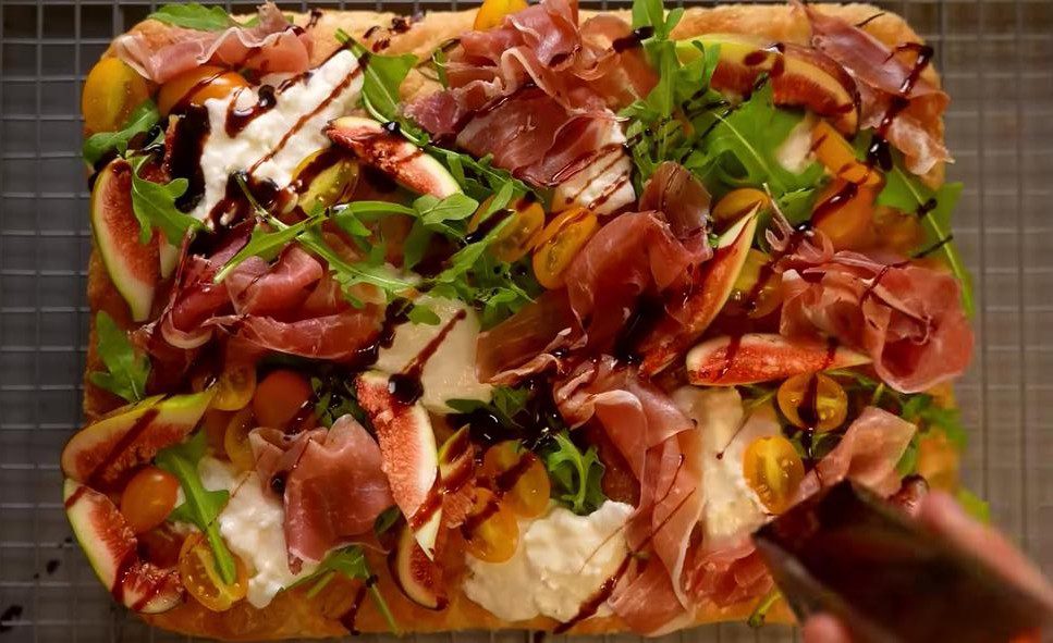 Retire do forno e finalize com a Stracciatella, o Presunto Tipo Parma Sadia Speciale, a rúcula, o figo e o tomate cereja;