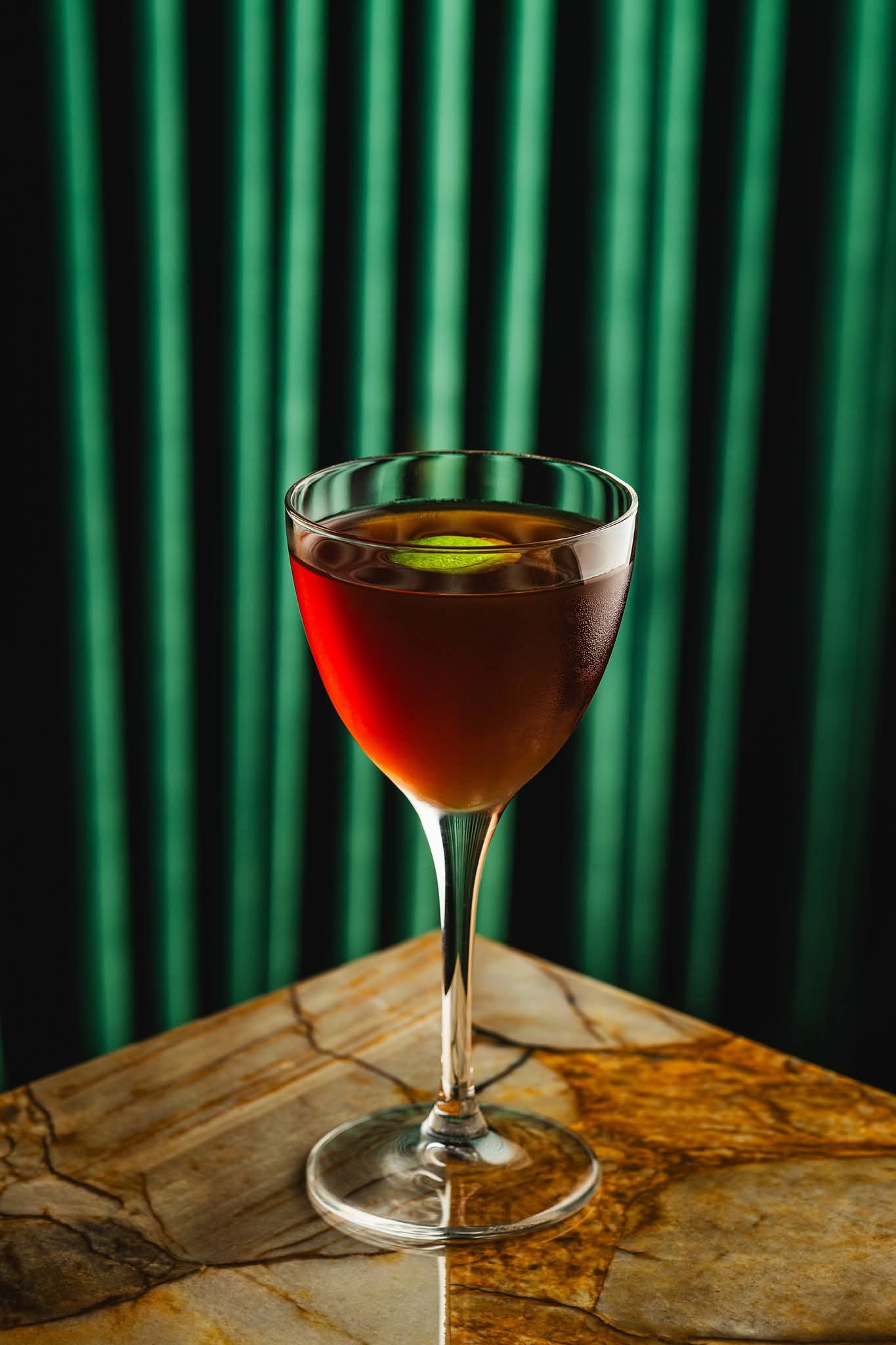 Nick & Nora / copo baixo. Uísque envelhecido, vermute rosso com cumaru e Cynar 70 com maracujá. Guarnição: moeda de limão-taiti. Releitura do boulevardier: conservação do tempo (uísque), poesia introspectiva (cumaru) e urbanismo paulistano (amargor).