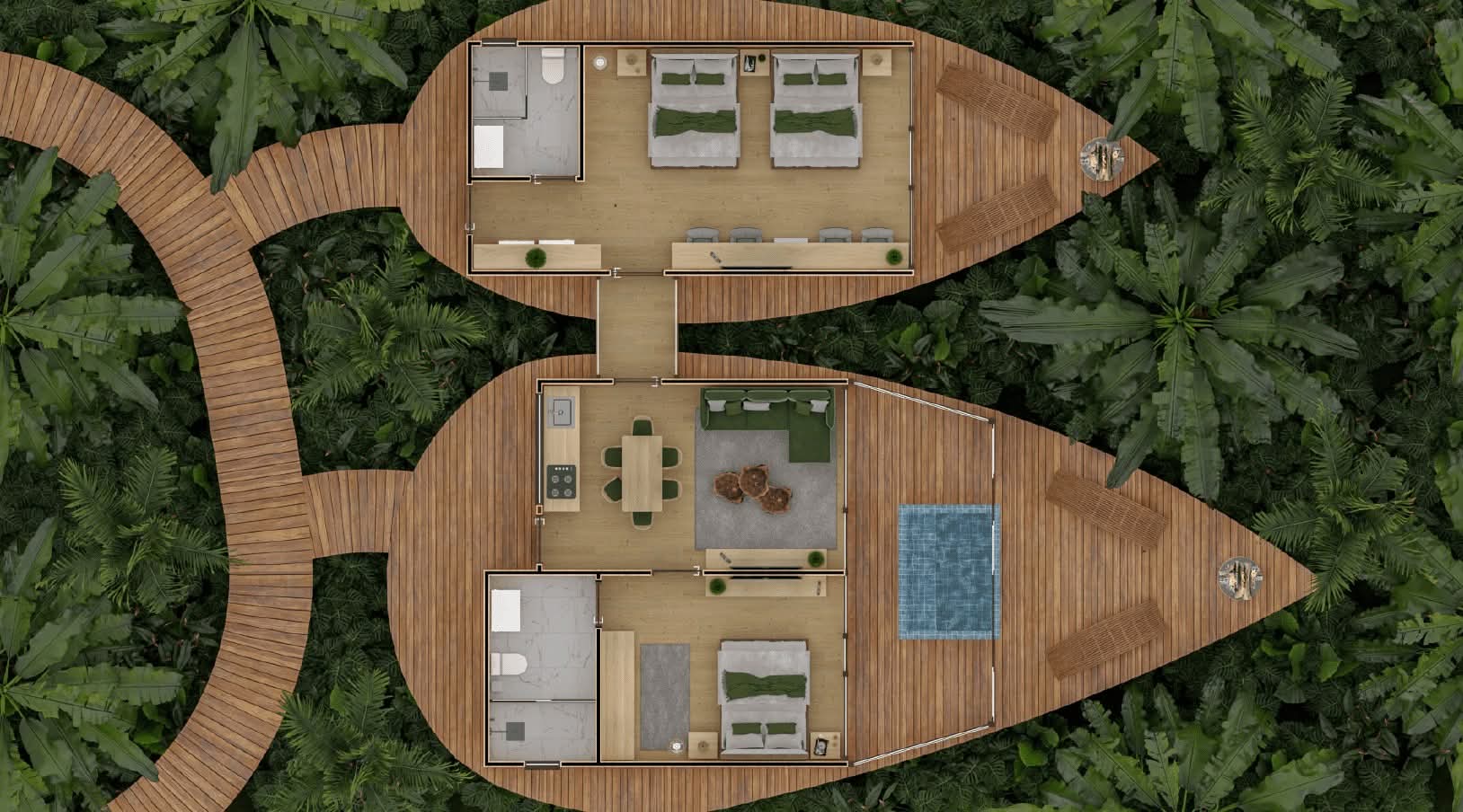 O Helicônia Hotel Design, em Curitiba, é um exemplo perfeito dessa abordagem. Inspirado na Helicônia rostrata, uma planta ornamental tropical, com folhas grandes e flores pendentes de cores vibrantes, o hotel se insere de forma orgânica entre árvores centenárias, preservando cada tronco como parte essencial do projeto. São 1.780 m² de arquitetura fluida, assinada pela Montipê Arquitetos, com estrutura da Tronco Estruturas e madeira engenheirada fornecida pela Urbem, referência nacional em soluções sustentáveis em madeira engenheirada. Cada curva e cada espaço são pensados para se integrar à vegetação, criando uma experiência de imersão na Mata Atlântica. O projeto de arquitetura é da Montipê Arquitetos.